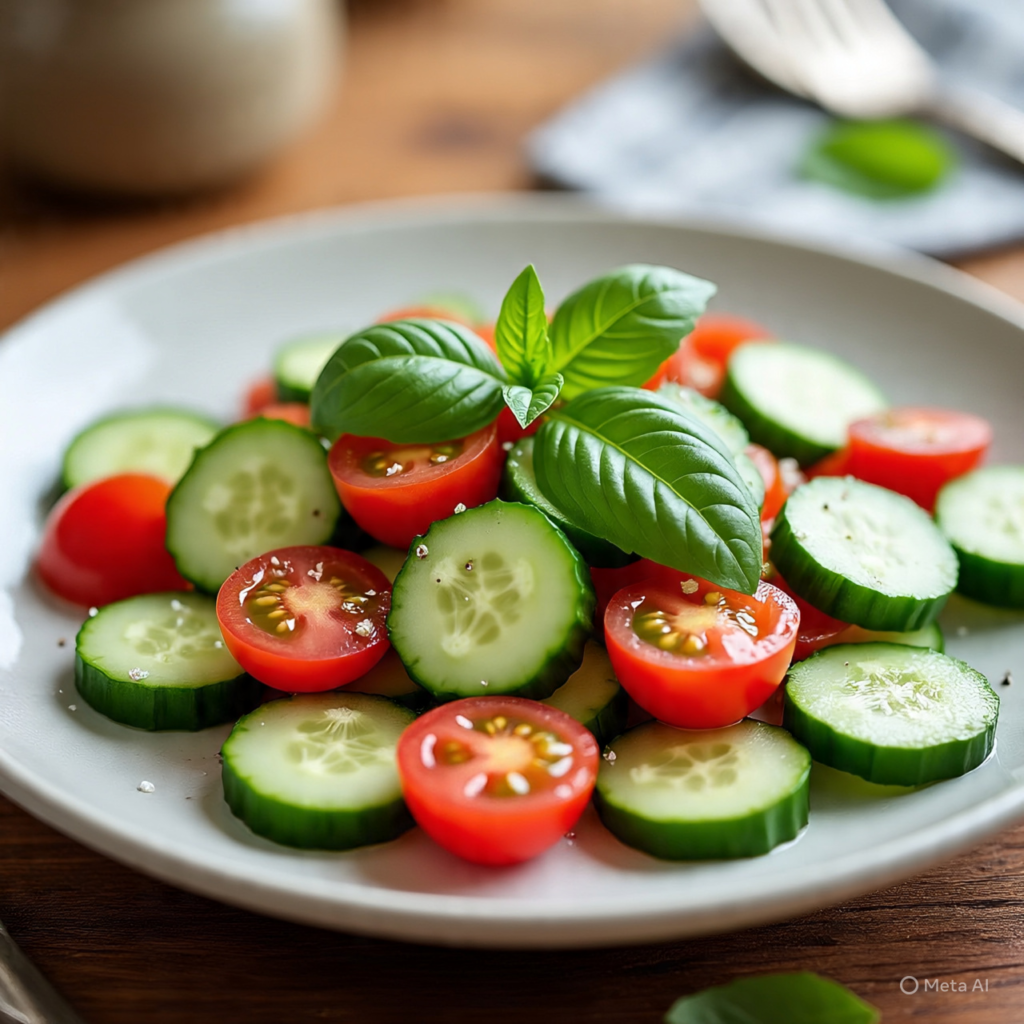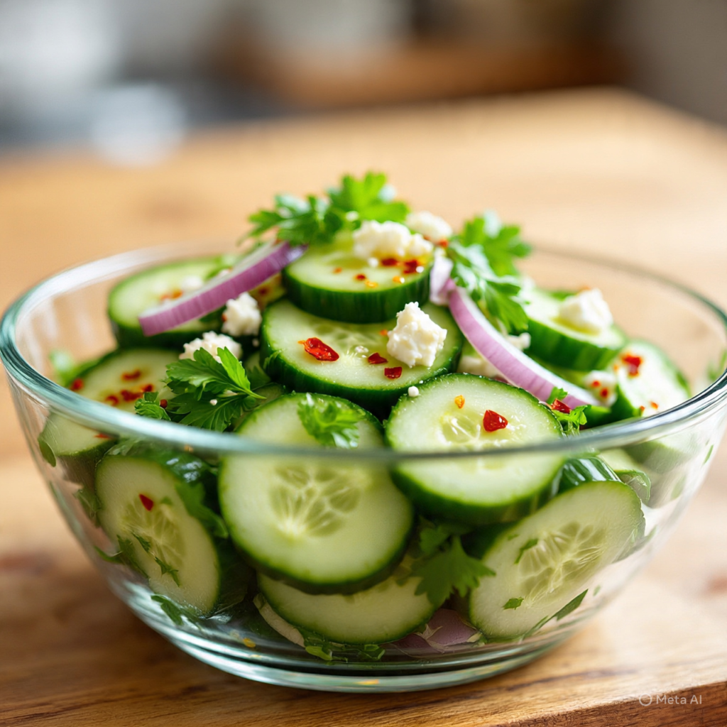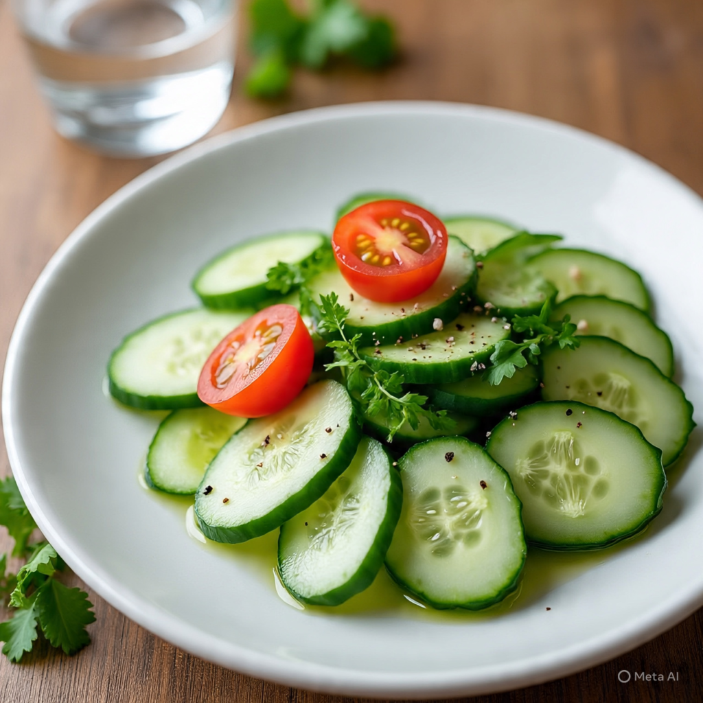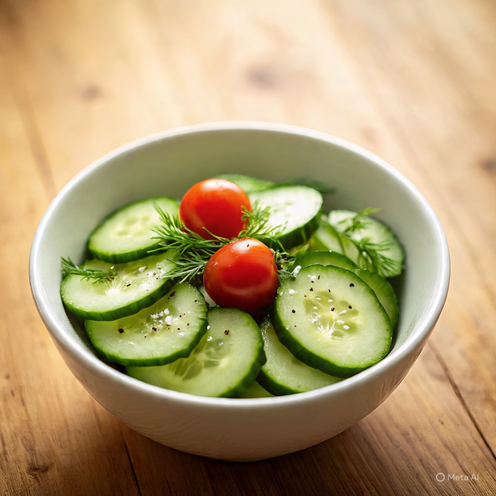 Slice cucumbers and toss them with lemon juice, olive oil, salt, and pepper. You can also add a little chopped mint for extra freshness. This salad is quick, healthy, and perfect when you need something light and refreshing.