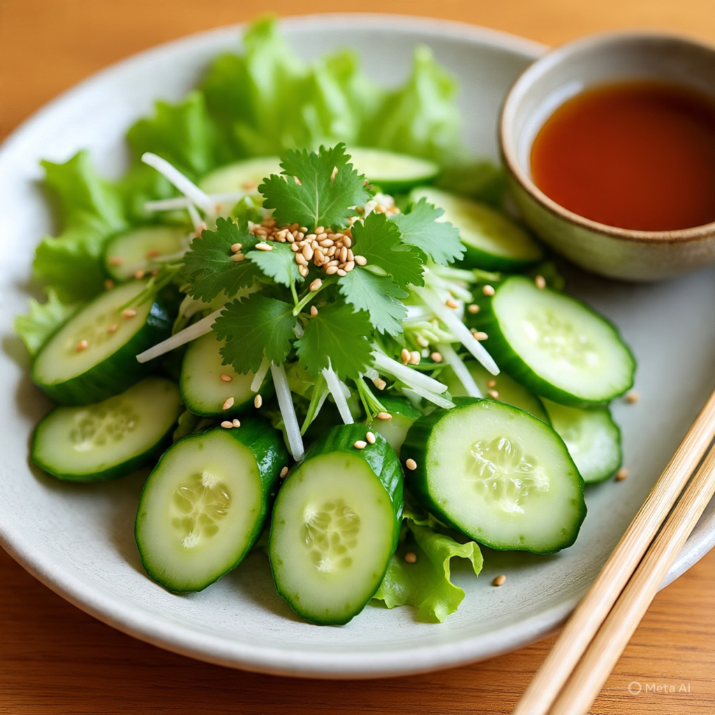 Slice cucumbers thinly and mix them with soy sauce, sesame oil, vinegar, and a small amount of honey or sugar. Sprinkle sesame seeds on top for extra texture. This salad is savory, slightly sweet, and very refreshing.