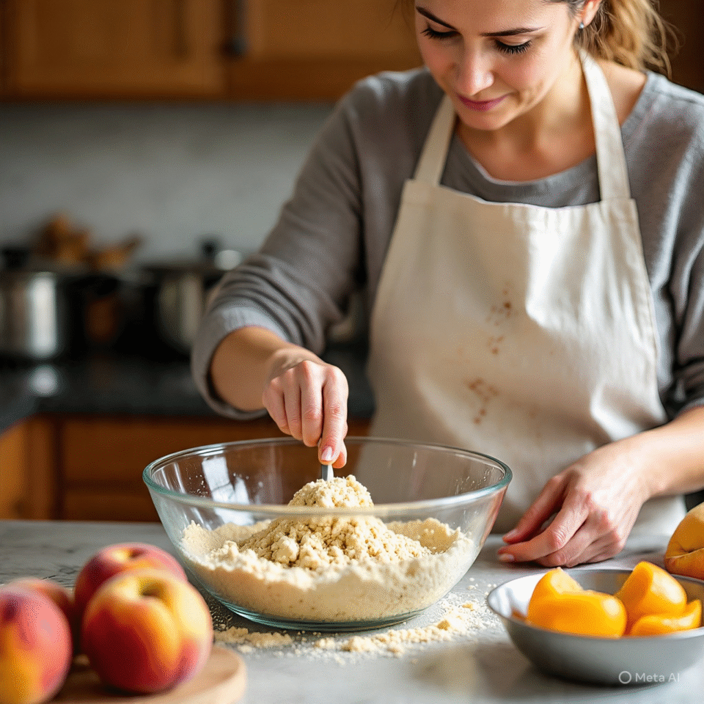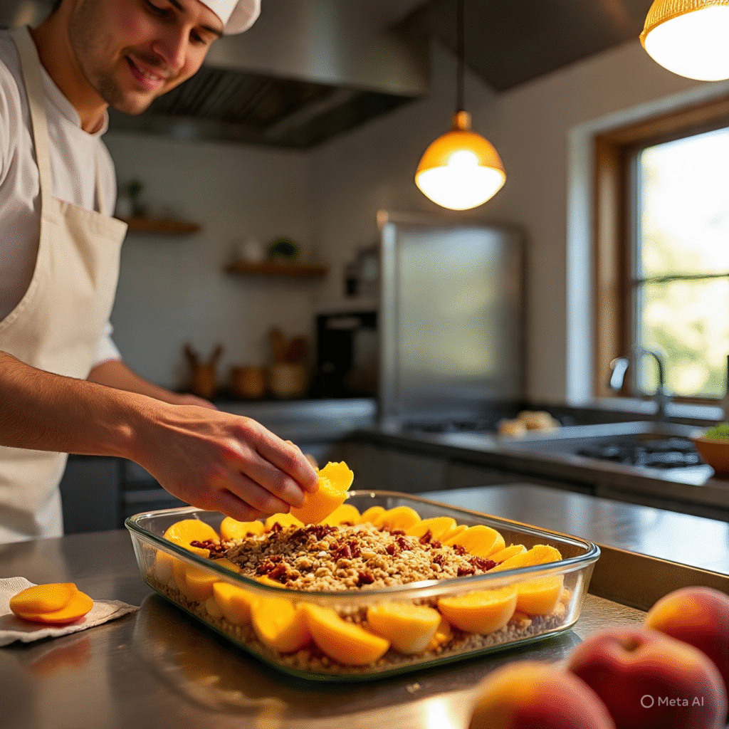 Bake for 35–40 minutes, or until the topping is golden brown and the peach filling is bubbling around the edges. The aroma of baked peaches and cinnamon will fill your kitchen — absolutely heavenly!