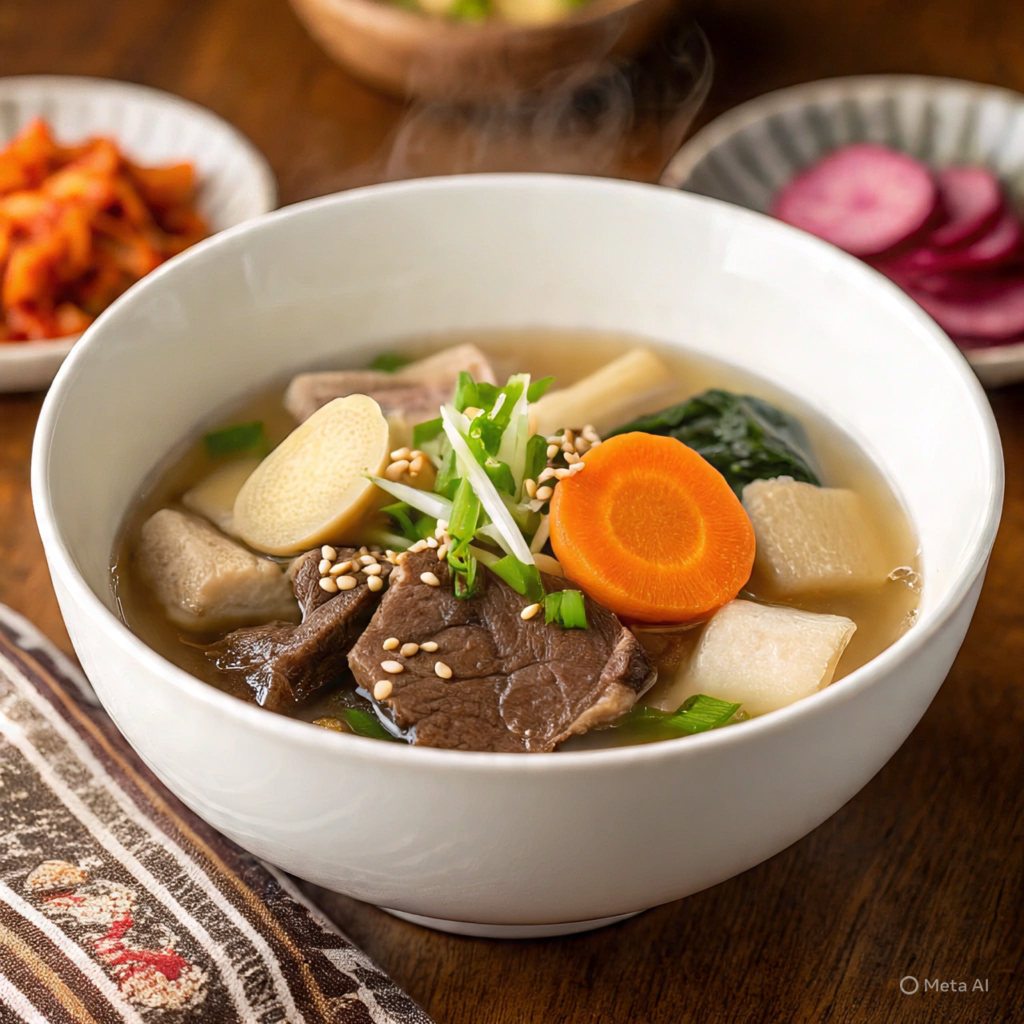 • Seolleongtang (Ox Bone Soup): Mild, milky broth simmered for hours